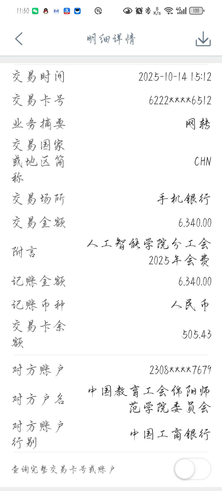 会费的通知》,人工智能学院分工会共收取2025年会费6340元,已通过银行转账至学校工会账户,现予以公示。